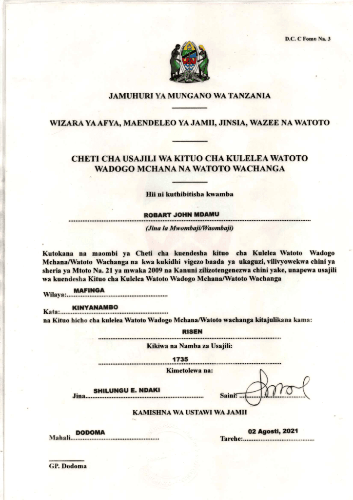 Dôležitým krokom k profesionalizácii našej pomoci bolo získanie oficiálnej licencie od tanzánijských úradov. Dňa 2. augusta 2021 nám Ministerstvo zdravotníctva, komunitného rozvoja, rodov, seniorov a detí v Tanzánii udelilo oficiálny certifikát o registrácii.